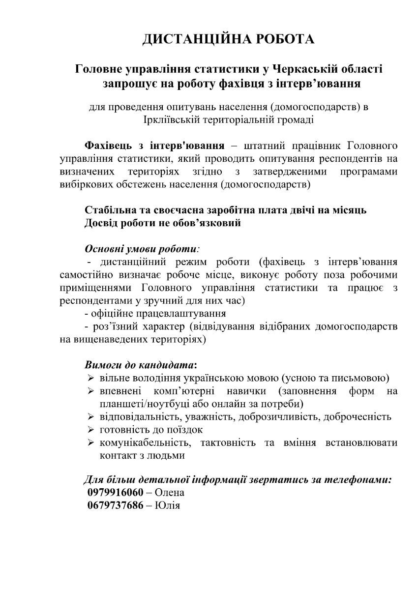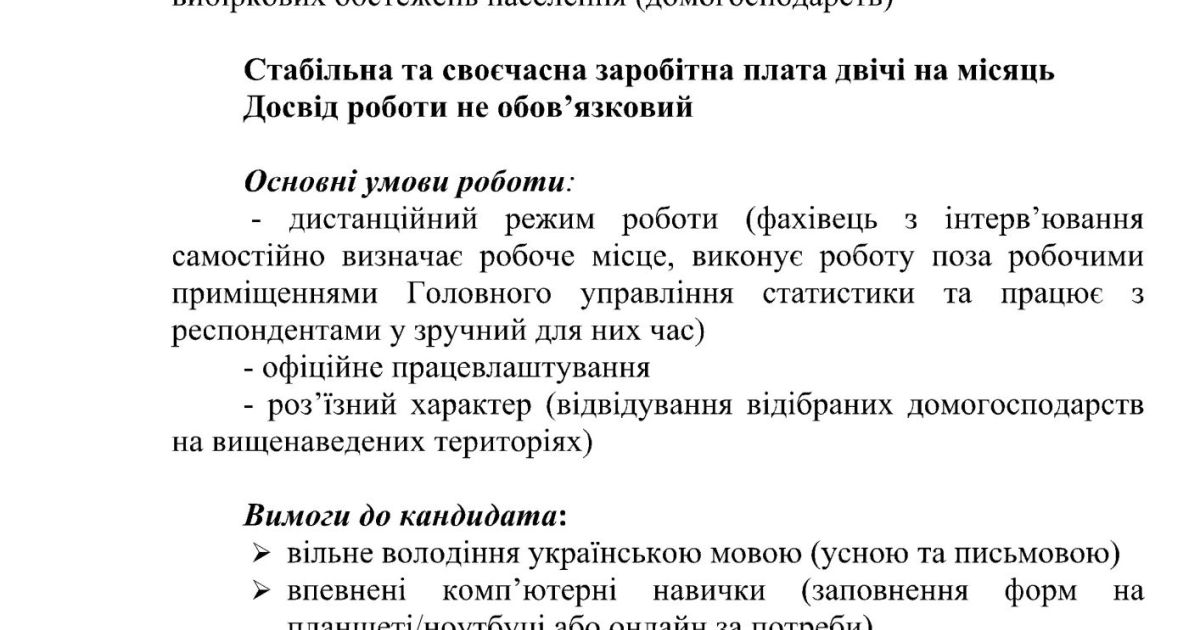 Головне управління статистики у Черкаській області запрошує на роботу фахівця з інтерв’ювання