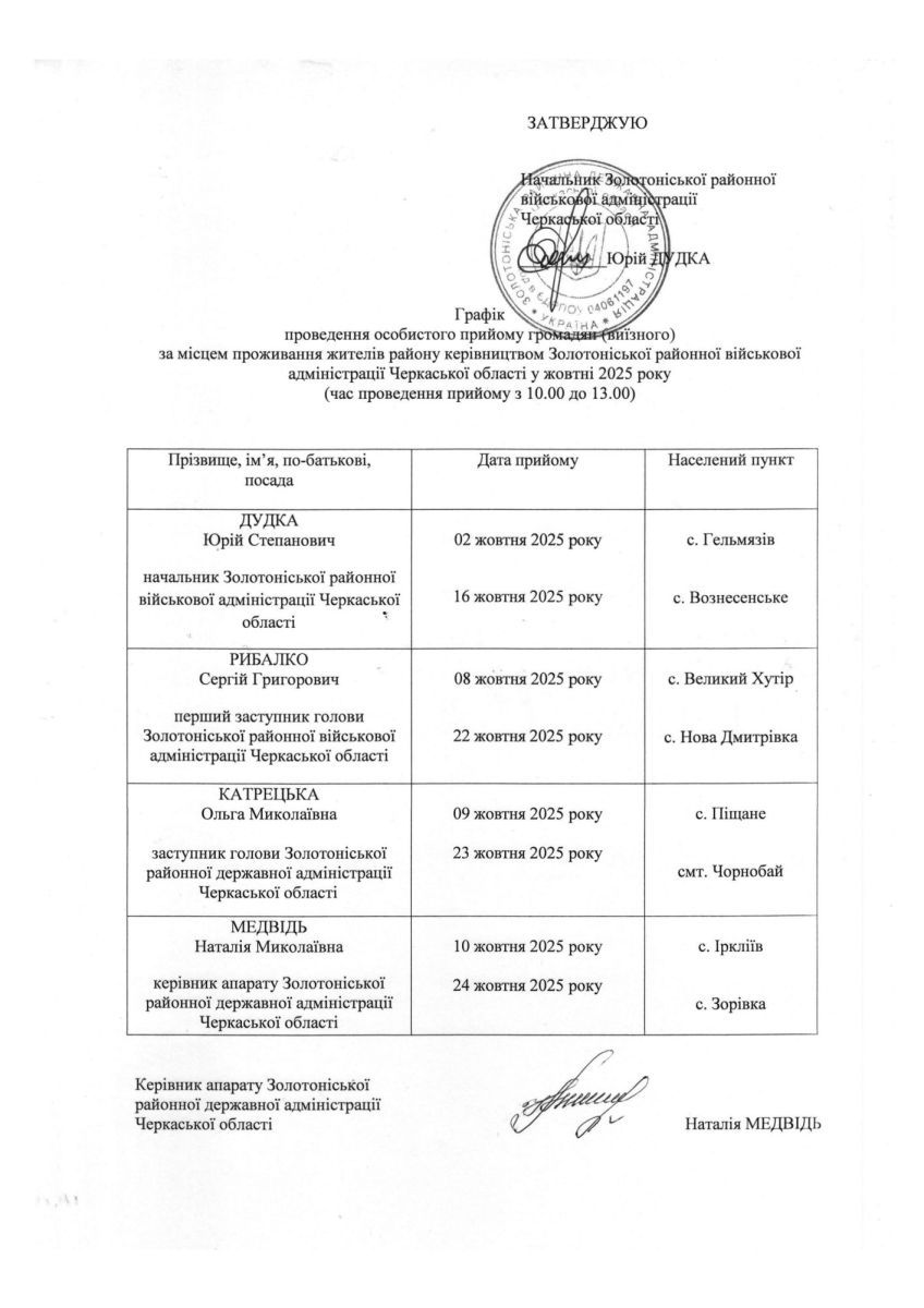 Графік прийому громадян керівництвом Золотоніської районної військової адміністрації Черкаської області у жовтні 2025 року