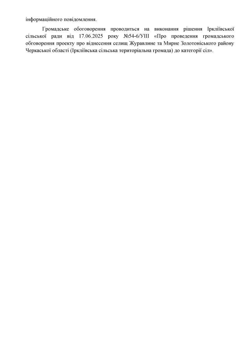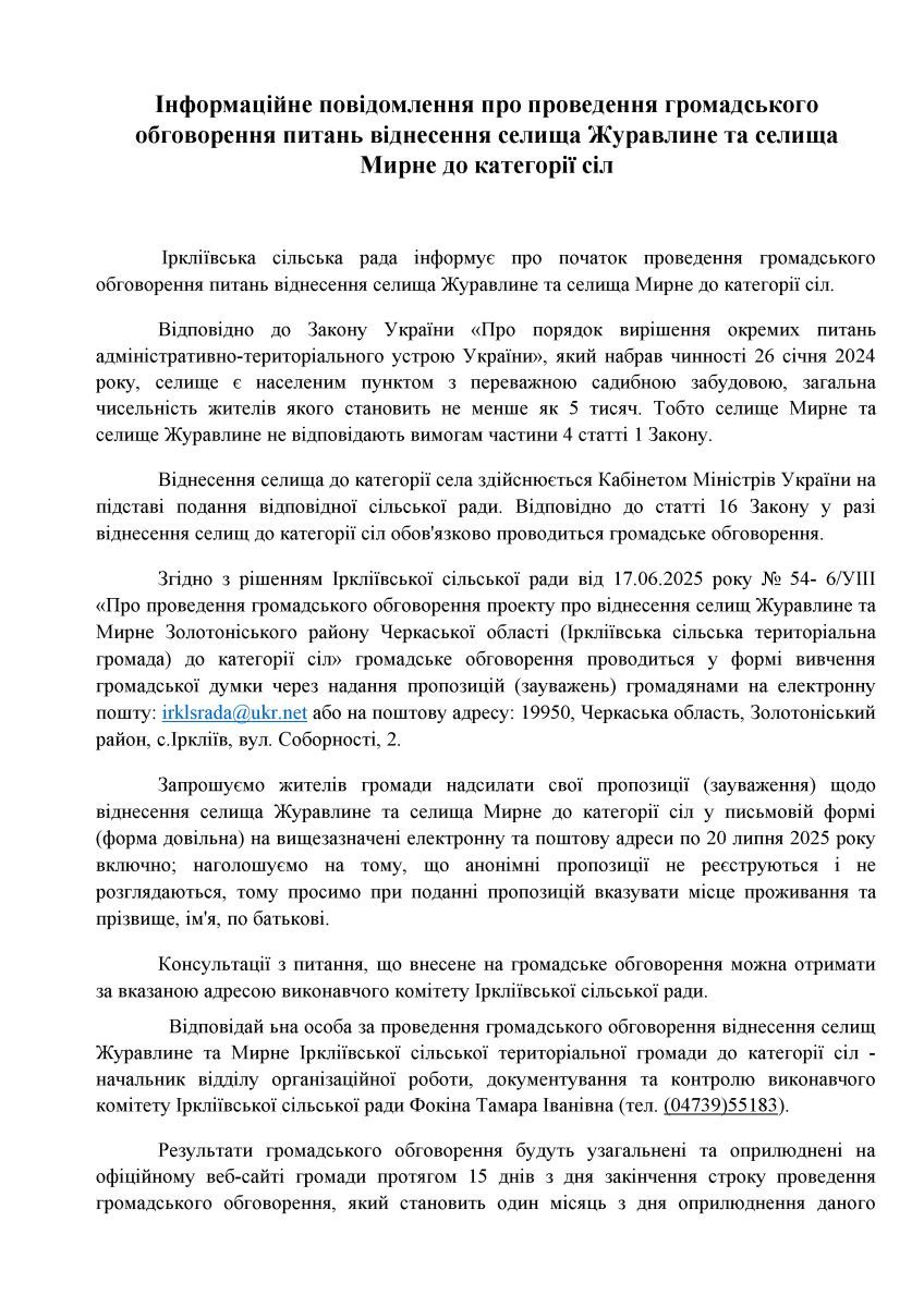 Інформаційне повідомлення про проведення громадського обговорення питань віднесення селища Журавлине та селища Мирне до категорії сіл