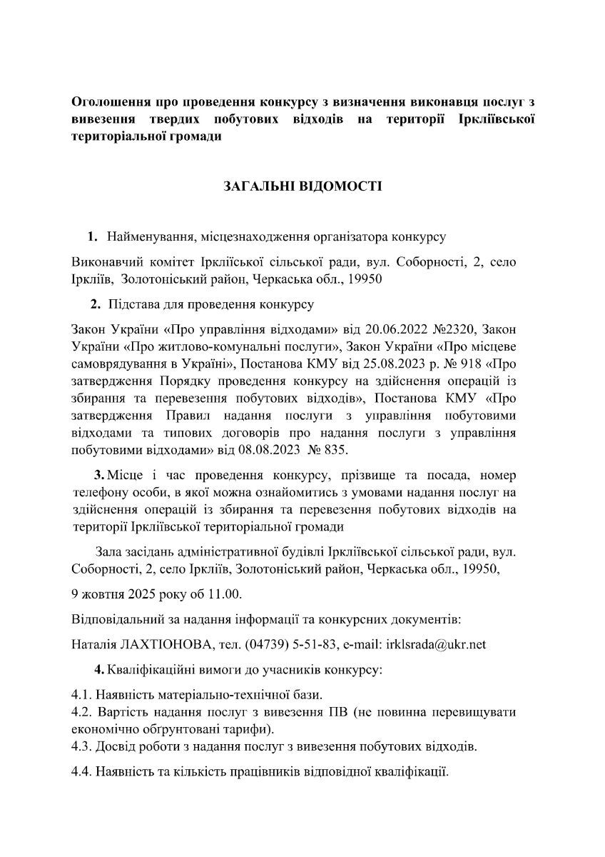 Оголошення про проведення конкурсу з визначення виконавця послуг з вивезення твердих побутових відходів на території Іркліївської територіальної громади