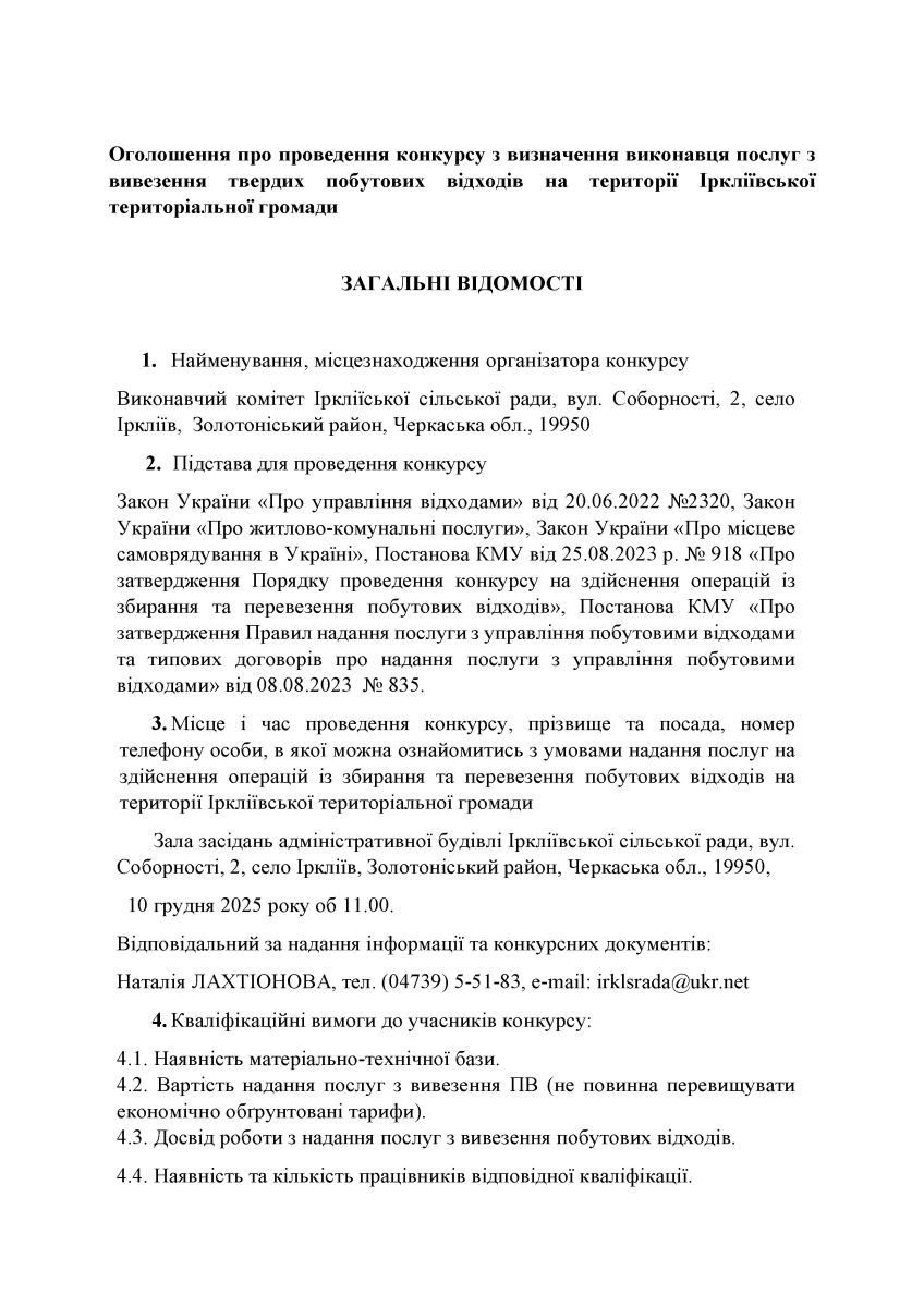 Оголошення про проведення конкурсу з визначення виконавця послуг з вивезення твердих побутових відходів на території Іркліївської територіальної громади