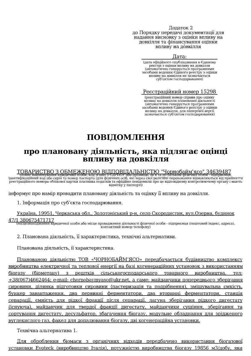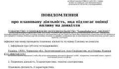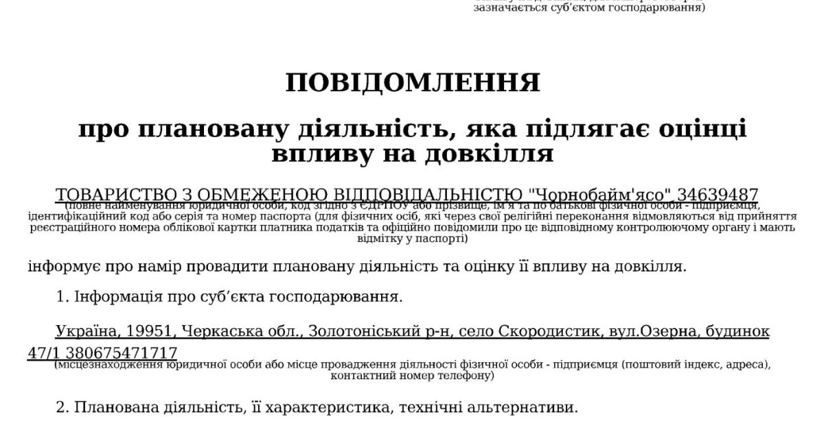 Повідомлення про плановану діяльність ТОВ «ЧОРНОБАЙМ'ЯСО»