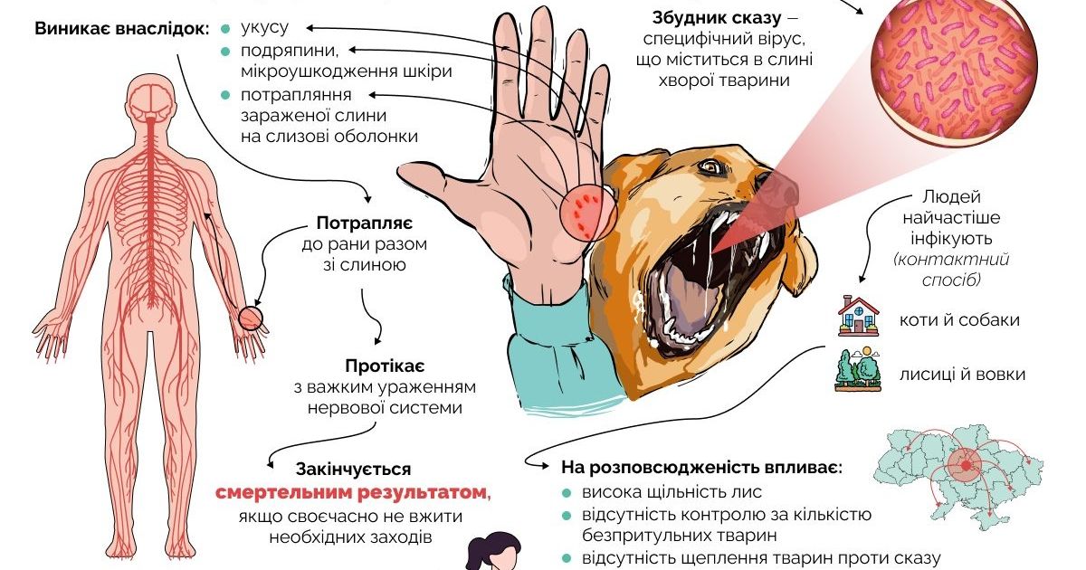 Вірус сказу передається через слину інфікованої тварини (собаки, коти, лисиці, кажани, їжаки, білки тощо).