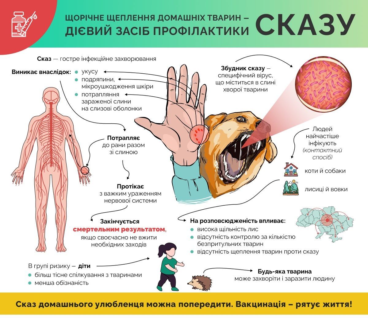 Сказ — це смертельне вірусне захворювання, що вражає центральну нервову систему, передається через укус, подряпину або ослинення інфікованою твариною (дикою чи домашньою). Симптоми включають агресію, гідрофобію, слинотечу, а після появи ознак хвороба стає невиліковною. Профілактика полягає у щорічній вакцинації тварин та екстреній антирабічній вакцинації людей після укусів.