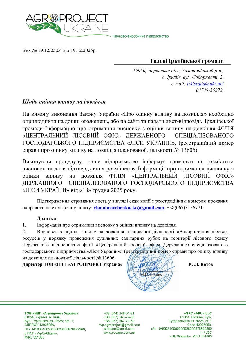 Висновок з оцінки впливу на довкілля ФІЛІЯ «ЦЕНТРАЛЬНИЙ ЛІСОВИЙ ОФІС» ДЕРЖАВНОГО СПЕЦІАЛІЗОВАНОГО ГОСПОДАРСЬКОГО ПІДПРИЄМСТВА «ЛІСИ УКРАЇНИ»