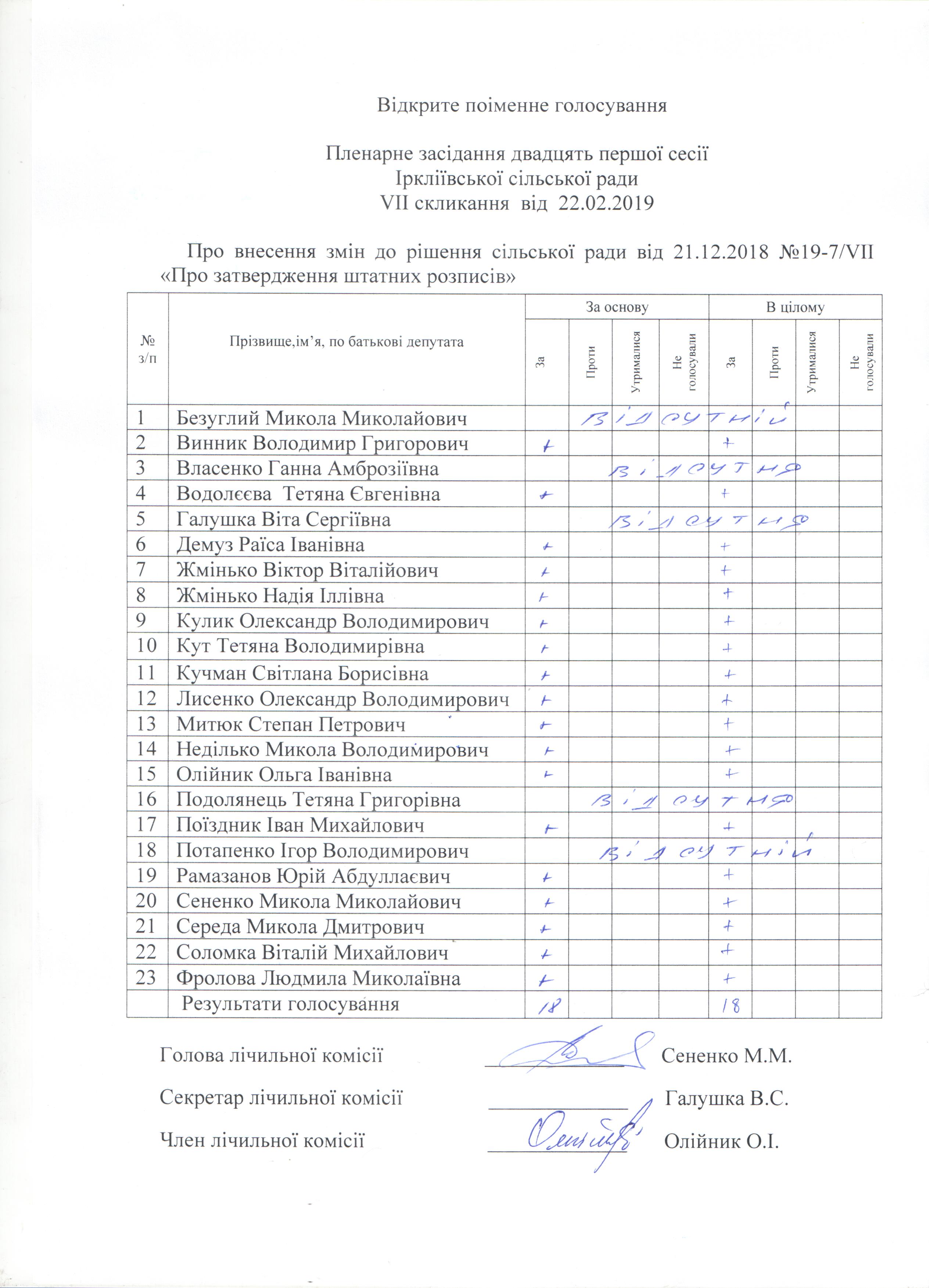 Рішення №21-12/VII Про внесення змін до рішення сільської ради від 21.12.2018 №19-7/VII «Про затвердження штатних розписів».