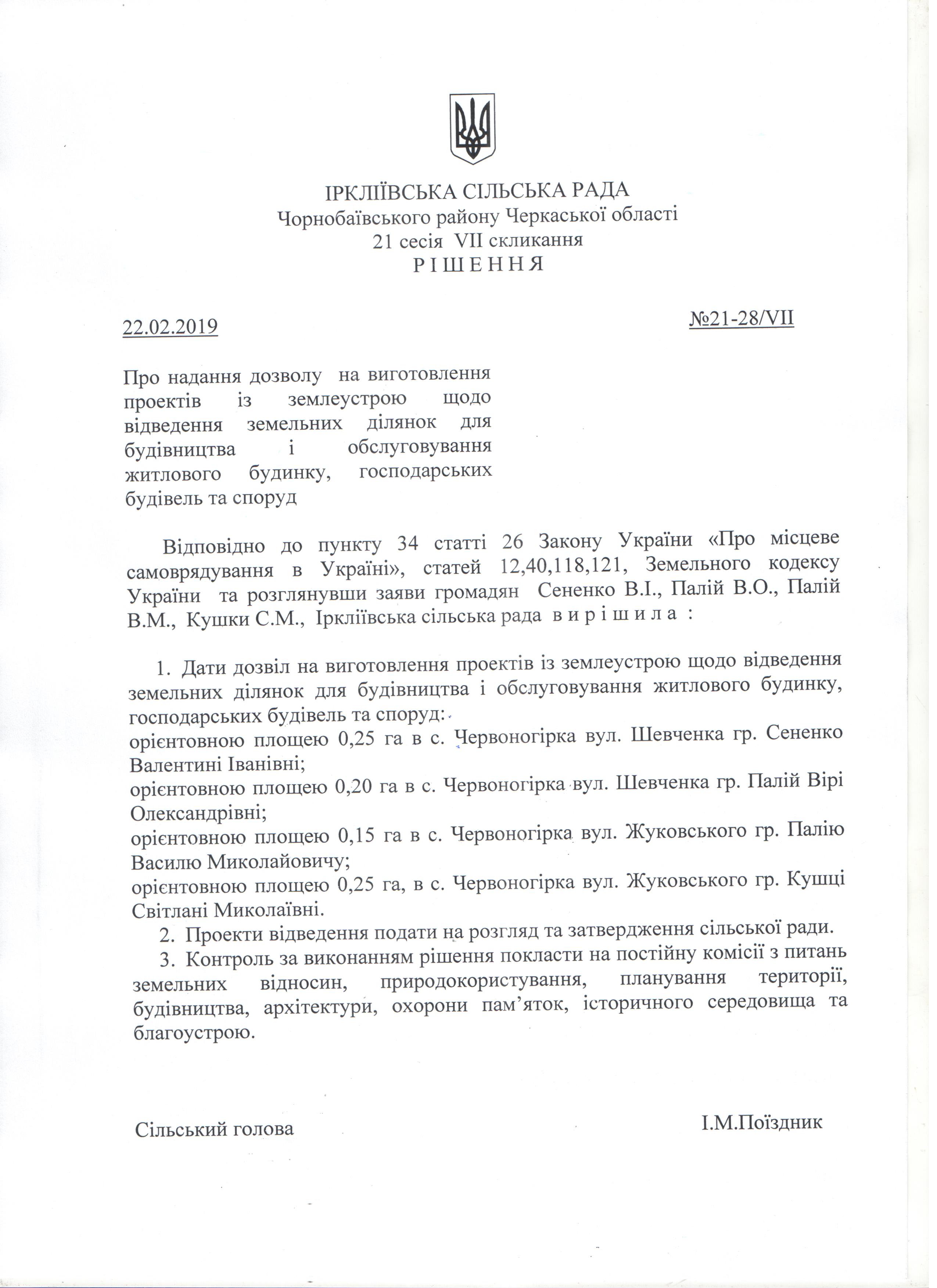 Рішення №21-28/VII Про надання дозволу на виготовлення проектів із землеустрою щодо відведення земельних ділянок для будівництва і обслуговування житлового будинку, господарських будівель та споруд.
